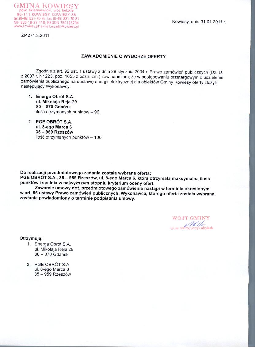elektrycznej dla obiektów gminy Kowiesy została podpisana umowa z PGE OBRÓT S.A.,