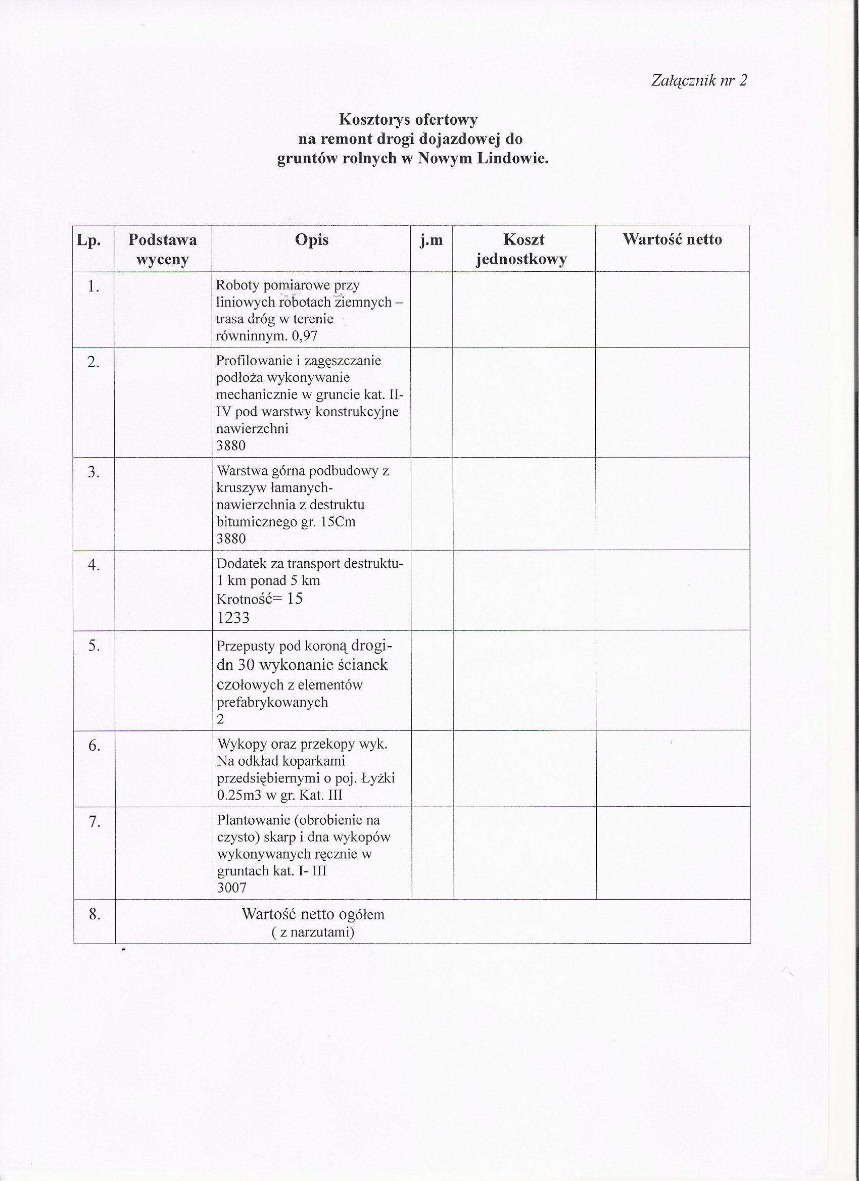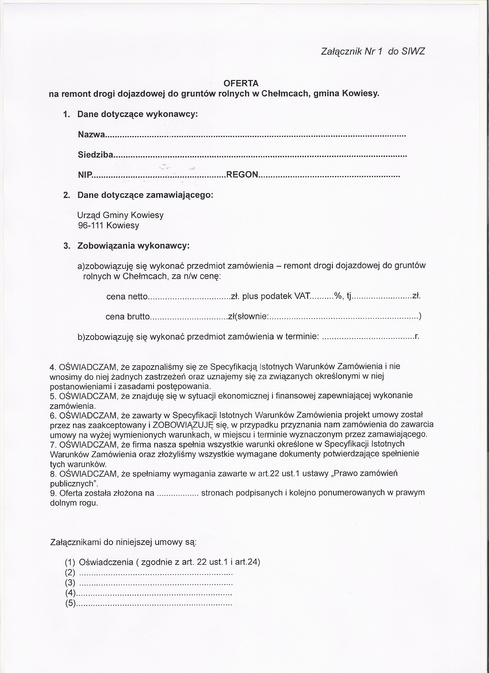 Dot. przetargu nieograniczonego na remont drogi dojazdowej do gruntów rolnych w Chełmcach, gmina Kowiesy.